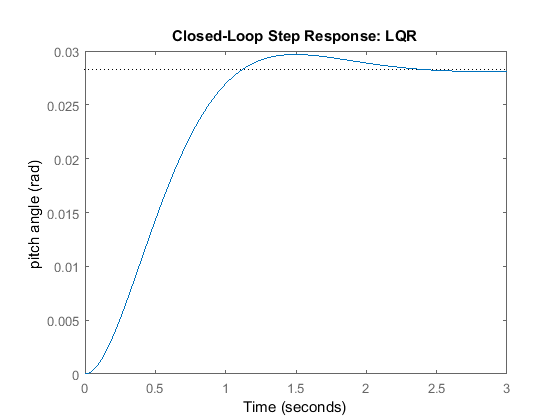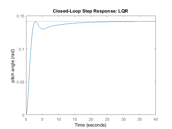 sys_cl = ss(A-B*K, B, C, D); step(0.2*sys_cl) ylabel('pitch angle (rad)'); title('Closed-Loop Step Response: LQR');