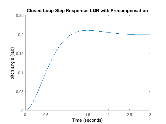 sys_cl = ss(A-B*K,B*Nbar,C,D); step(0.2*sys_cl) ylabel('pitch angle (rad)'); title('Closed-Loop Step Response: LQR with Precompensation');