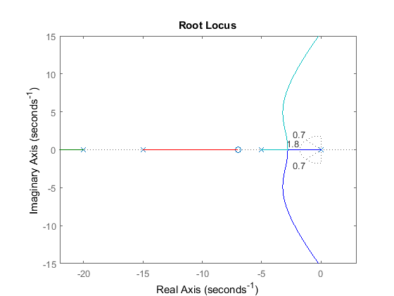 From the plot above we see that there is part of the root locus inside the desired region. Therefore, in this case, we need only a proportional controller to move the poles to the desired region. You can use the rlocfind command in MATLAB to choose the desired poles on the locus: